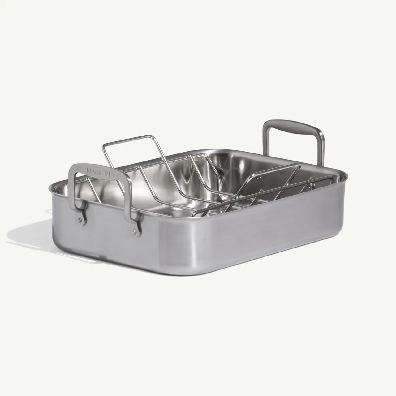 This is a durable, warp-resistant stainless clad Roasting Pan. It guarantees perfectly cooked birds, juicy rib roasts, and more of your favorite holiday proteins.