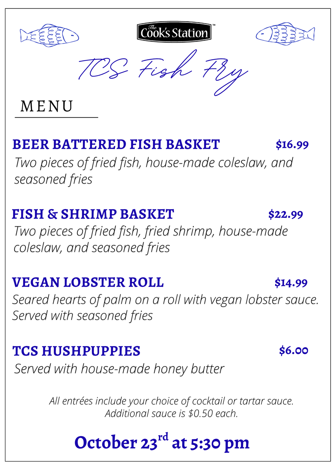 Join us at The Cook’s Station on October 23rd at 5:30 PM for a mouthwatering Fish Fry you won’t forget. Crispy, golden-fried goodness, fresh sides, and cold beer/ wine to pair with it— it’s the perfect summer evening!